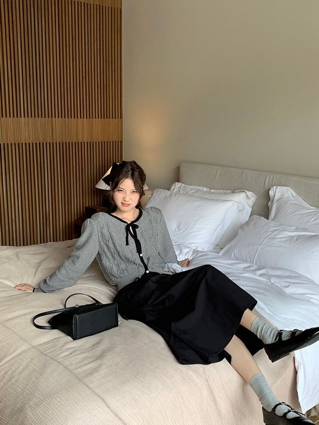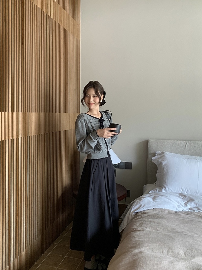 現貨 Freesia 8801 法式復古綁帶珍珠雕花撞色針織上衣