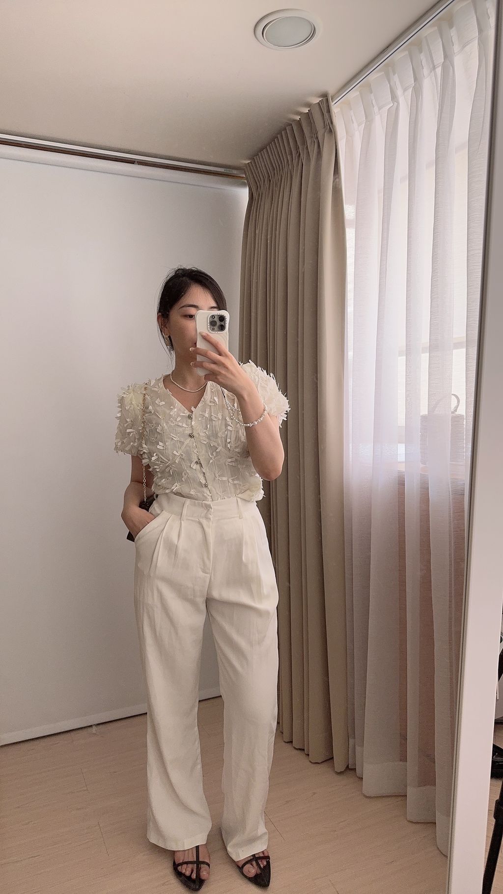 Fresia 5056 立體蝴蝶結V領短袖花朵釦子上衣(2color)
